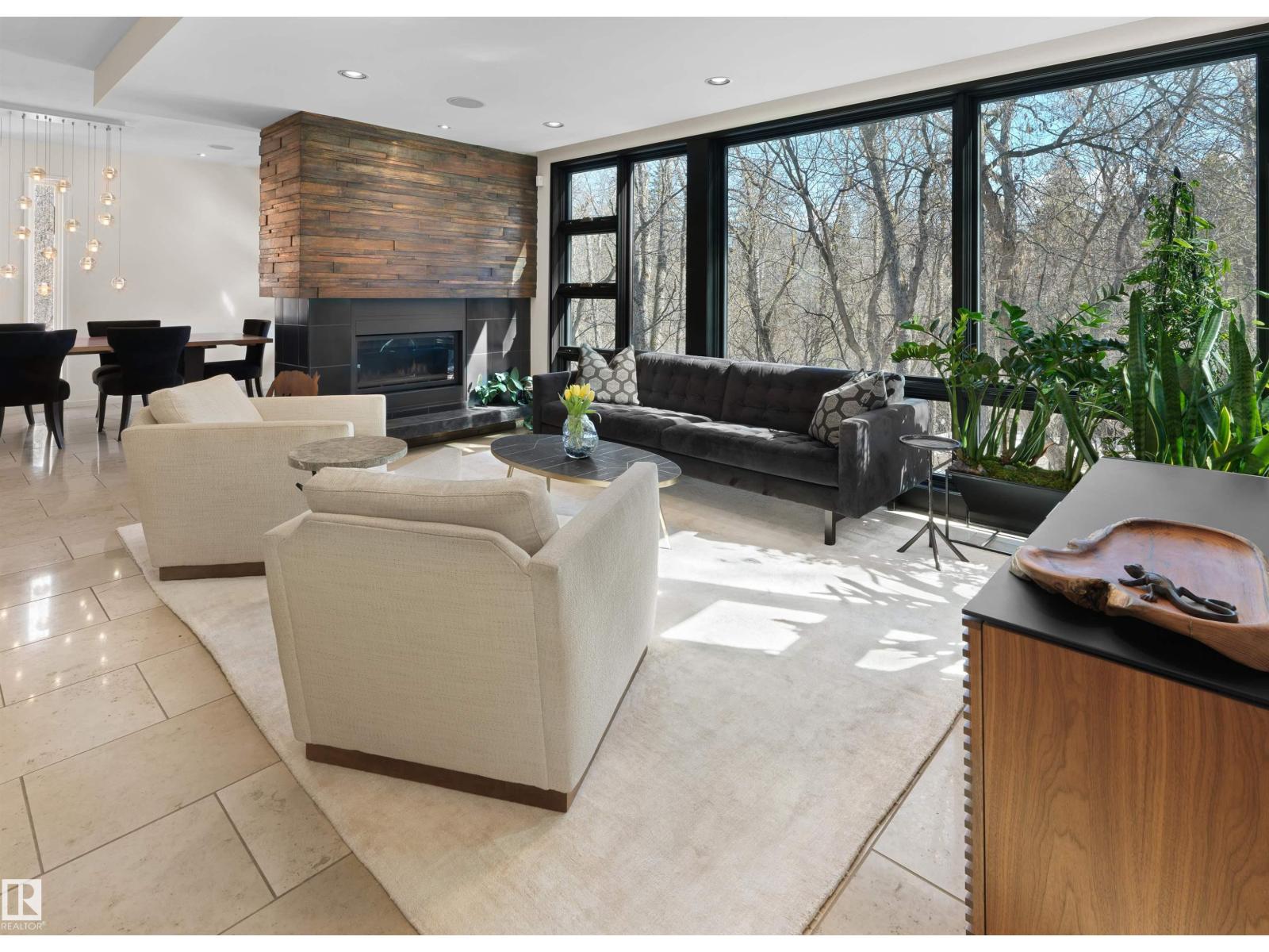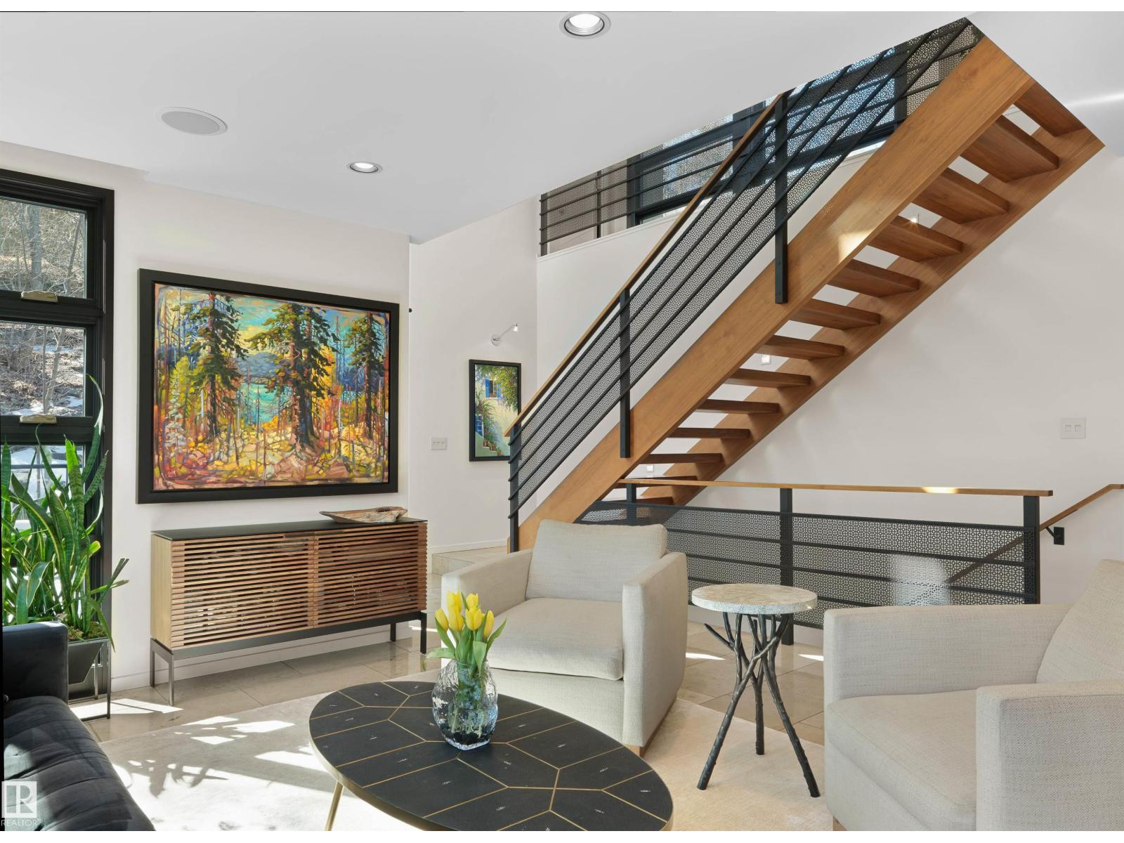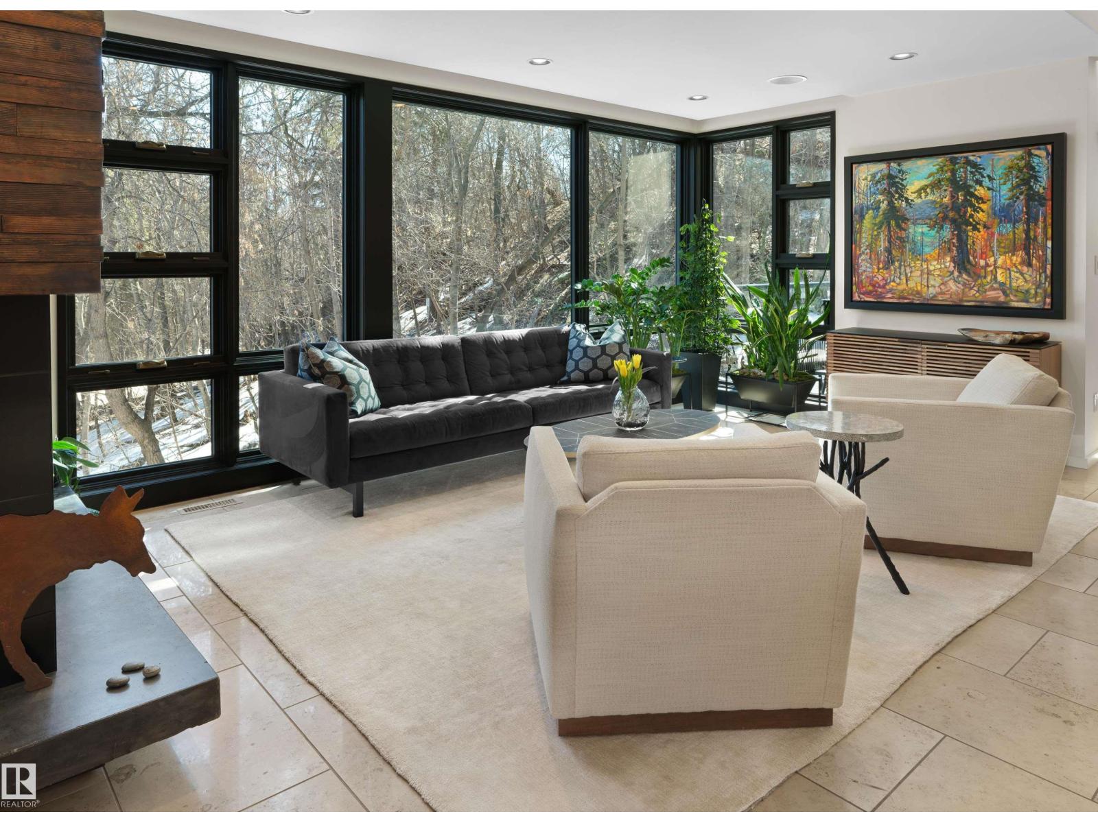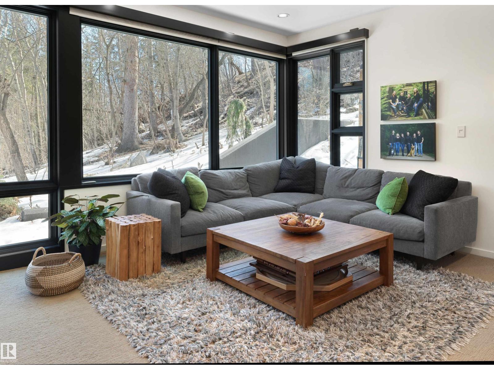 Located at 9651 87th Avenue NW, this home is tucked away at the end of a cul-de-sac, set into the hillside on a double lot and surrounded by Mill Creek Ravine Park on three sides.