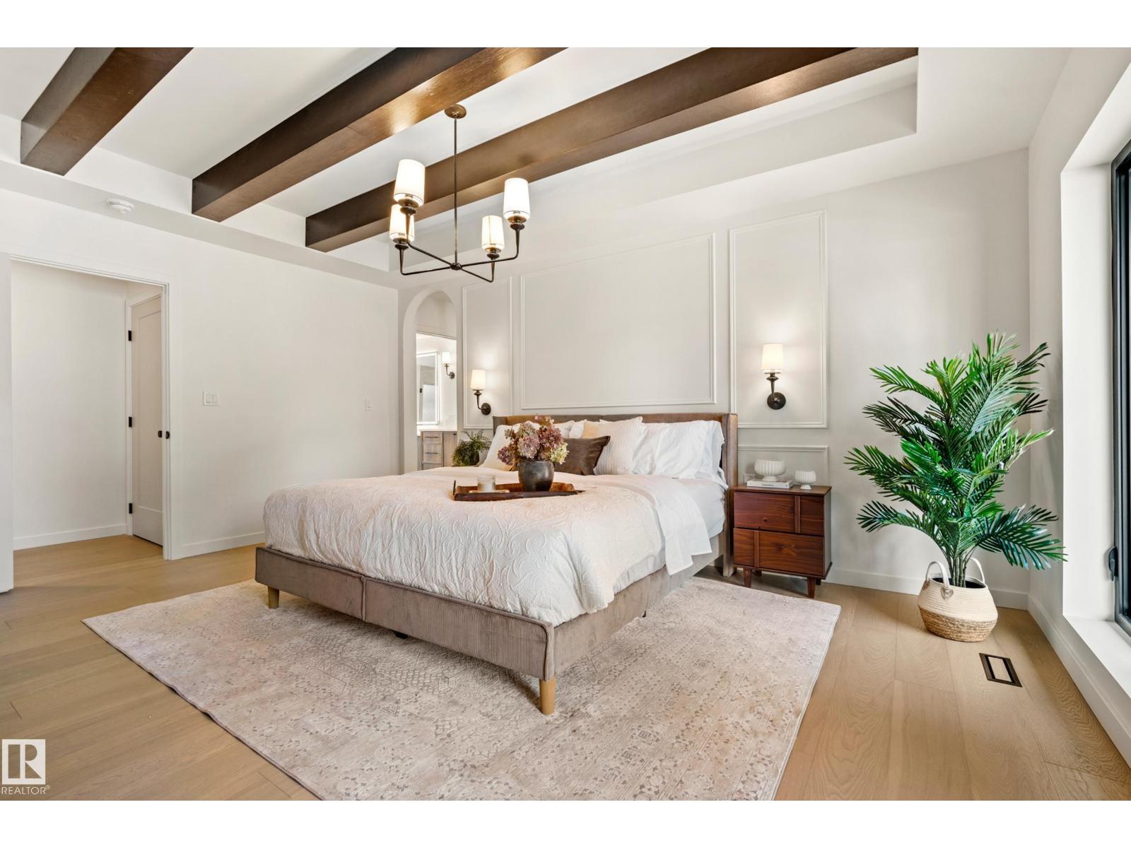 The primary suite is straight out of a magazine, complete with custom beams and a massive ensuite featuring a standalone tub, dual sinks with vanity, and a large walk-in shower.